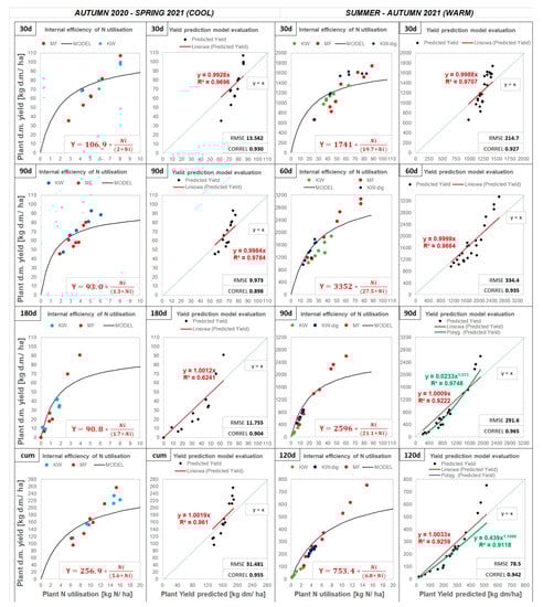 The internal efficiency curves (Figure 5) show the d.m. yield as a function of plant N utilization for all fertilizers for each harvest in both seasons. The response curves were fitted using the Monod kinetics model (first and third columns), then the calculated and measured yields were compared (figures in the second and fourth columns). Additionally, a power model (fourth column—90 and 120 days) was related to the linear function of predicted versus measured data. The model is described by the following Equation (1):