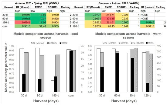 Figure 6 shows the applicability of the Monod models for the prediction of the dry matter yield as a function of N utilisation per ha. For the last two scenarios in the warm season (90 and 120 days), the power model was tested. The comparison is expressed by three precision parameters: square root (R2), root mean square error (RMSE), and correlation coefficient (CORREL). A subjective ranking is expressed by points given for the quality of each parameter. The best parameters are coloured green, while the worst are coloured red. Taking into account all three precision parameters, the best Monod model fits were found for 30 and 90 days (cool season) and for 30 and 60 days (warm season). This indicates that in the first half of growth, nitrogen is the most relevant growth-stimulating parameter. A similar modelling approach was used in other studies [32,33].