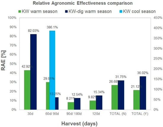 Figure 7 summarizes all previously presented data by showing the calculated relative agronomic effectiveness for the fertilizer materials, where it was possible to calculate AAE. RAE is actually the AAE related to the AAE of the reference mineral fertilizer. The RAE based on the utilisation of N (RAE(N)) was calculated and presented for each subsequent harvest and also as a total value after adding all the harvest data (total N). However, the d.m. yield-based RAE(Y) was calculated only as a total value (Total Y). N-utilization-based RAE(N) better characterizes the fertilizer material as it also contains the dry-matter yield when calculating the total N-utilisation per area. In general, KW works better than MF in the cool season, but RAE was only shown for 90 days (386.1%) due to very poor linear regression of the corresponding MF response as a reference. Therefore, it was not possible to calculate the RAE for KW in the cool season for each harvest, but it was nevertheless always higher than the RAE of MF. Under warm conditions, for the next 4 months, KW showed RAE in decreasing values: 43%, 29%, 8%, and 9%. KW-dig mostly demonstrated higher values: 82%, 13%, 13%, and 15% for subsequent harvests. In total, the RAE of KW–dig was 32% versus 27% for KW (N-based) and even 36% versus 21% (yield-based).
