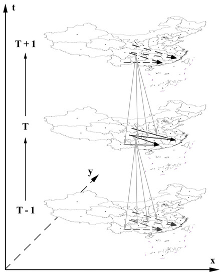 The chart for temporal dependence, spatial dependence, and space-time diffusion structure of panel migration flows. (Gray arrows indicate temporal dependence, solid black arrows indicate spatial dependence, and black dotted arrows indicate space-time diffusion structure of panel migration flows.)