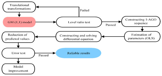 The basic principle of the GM (1, 1) prediction model can be summarized as follows. Firstly, we used the method of cumulative generation to make the data have specific laws. Then we established the first-order differential equation, solved it, and carried out the cumulative reduction in the result; the obtained value was the prediction value. The modelling procedure for the GM (1, 1) model is reflected in the framework diagram in Figure 2.