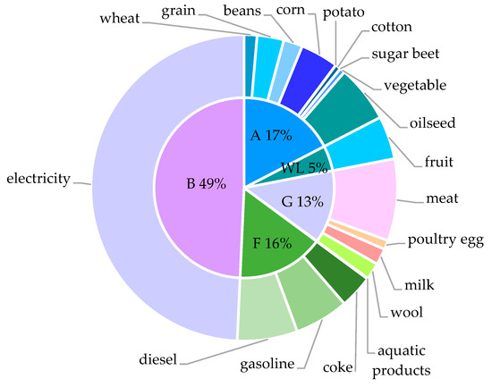 Percentage of the eef of each land type. (A is agricultural land, B is building land, F is fuel land, G is grassland, W is water area, and WL is woodland.