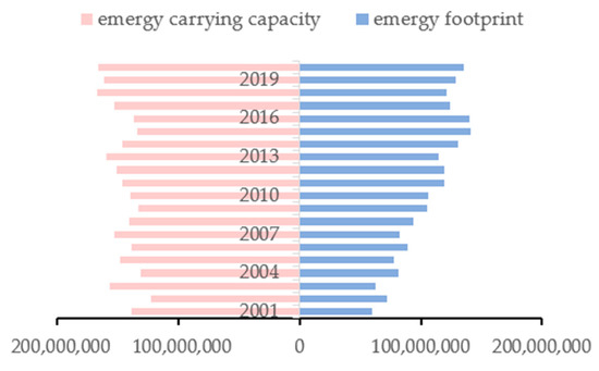 From Table 2, we can obtain that the maximum value of solar emergy corresponding to the first four types of emergy was rain potential energy and that the sum of the ecc of rain potential energy and the energy of Earth’s rotation was 7.54 hm2, and considering 12% of the land was for biodiversity conservation, the ecc was 6.64 hm2 in 2020. The total emergy of Gansu Province was 5.85 × 1022 sej, the emergy density of the area was the proportion of its total emergy relative to its total area, and the emergy density in 2020 was