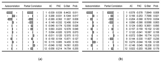 From Table 5, we can obtain the p-values and t-values of the ECC, where p-values = 0.035 < 0.05 and where t-values were between 1% and 5%, indicating that the hypothesis was rejected at the 1% confidence interval. As the original sequence was stable after taking logarithms and first-order differences, the parameter d of the ARIMA model was one.