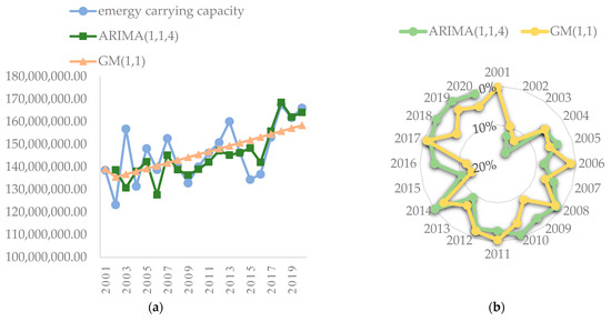 By viewing the graph comparing the actual and predicted values of the ECC in Gansu Province from 2001 to 2020 (Figure 6a), we can obtain that the predicted values of both models fluctuated up and down around the true levels. The predictions of the GM (1, 1) increased year by year, while the forecast values of the ARIMA (1,1,4) were more in line with changes in the actual values; both were in the range of 1.2 × 108 hm2 and 1.65 × 108 hm2 and varied constantly.