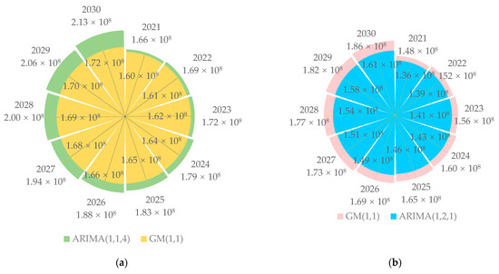 Finally, SPSS Statistics 21.0 was used to anticipate the ECC from 2021 to 2030 and to compare the predictions made by the GM (1, 1). In Figure 7a, the ARIMA (1,1,4) results increased year by year, while the ECC foreseen by the GM (1, 1) was stable around 1.60 × 108 hm2. The trend toward increasing values over time was not significant, and the predictions of the ARIMA (1,1,4) were all greater than those of the GM (1, 1).