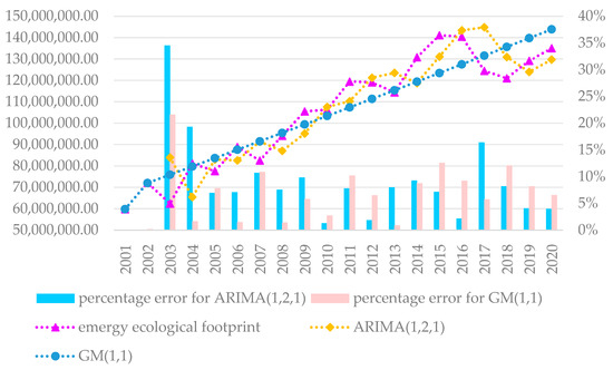 As can be seen from Figure 8, the maximum absolute percentage error of the predicted values from the ARIMA (1,2,1) model was 34.49% (in 2003), and the minimum absolute percentage error was 1.25% (in 2010), with most of the errors within 10% and a MAPE of 9.2%. The maximum absolute percentage error of the predicted values obtained from the GM (1, 1) model was 21.57% (in 2003), and the minimum absolute percentage error was 0.01% (in 2001), with most of the errors distributed within 5% and a MAPE of 6.69%. The MAPE values of both models were less than 10%, and the forecasting accuracy was high. According to the results, the GM (1, 1) model predicts relatively good results and could be utilized to predict the EEF from 2021 to 2030.