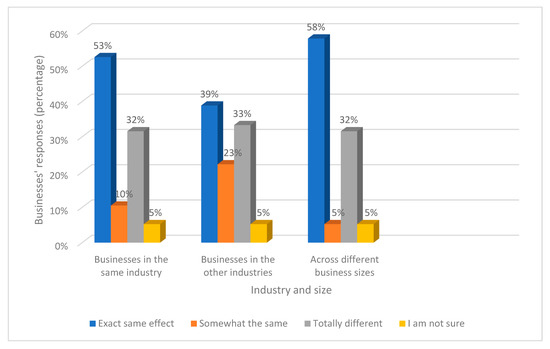 Respondents expressed differing perspectives on whether the effect of COVID-19 differed across geographic locations (parts of the country) for businesses in the same industry as theirs, businesses in other industries, and businesses of various sizes. For businesses in the same industry, 32% believe the effect is different, 53% believe it is the same, approximately 10% believe that the effect is partially the same, and the balance are uncertain about the effect of COVID-19. Most businesses (58%) believe that the effect was the same across different sizes of businesses in the same sector. About 33% believe that businesses in other sectors were affected completely differently, while 23% believe the effect was the same. Lastly, 58% believe that the effect is the same across business sizes (