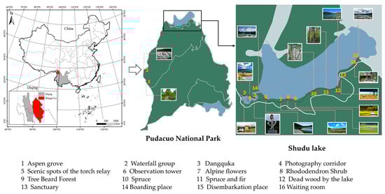 In 2018, Pudacuo implemented stricter environmental protection measures by closing the Bitahai and Miritang scenic areas and opening only the Shudu Lake area, which will be used as the study area in this paper (Figure 2). On the southern shore of the Shudu Lake, a wooden walkway was built along the lake to facilitate visitors’ visits, and signage and interpreters were added at the sites. However, there is a single form of environmental interpretation service that lack of content, and visitors do not have a strong sense of experience, mainly in terms of the following: (1) The content of the interpretation is simple and unprofessional, and confusing information is given to the tour group, with little mention of the impact of time; in the introduction detailing the length of the trail and walking time, the interpreter often hints to visitors, resulting in most visitors giving up the hiking route, which greatly reduces the recreational experience. (2) The excessive jargon confuses general visitors, as it is less participatory and experiential, and the abstract descriptions of plants do not encourage visitors to identify plants. (3) The interpretation facilities are mainly signage, the science museum is closed all year round, the interpretation activities are monotonous, and there are few boat route interpretation activities.