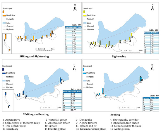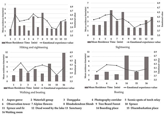 The “tourism emotional path” (TEP) model has been studied, which uses a two-dimensional coordinate axis to quantify and visualize spatiotemporal emotional experiences, express tourism emotions using a vertical axis, and describe spatiotemporal paths using a horizontal axis [20]. It shows the entire process of emotional fluctuations and changes in the whole process of tourism experience as time and location change, and visualizes the entire process of visitors’ spatiotemporal emotional experience in Pudacuo country using a two-dimensional composite chart (Figure 6). It was used to express the average time of visitors’ stay at specific interpretation locations using horizontal and vertical coordinates of a histogram (the total time of visitors’ stay at locations calculated based on a geographical processing model in seconds, divided by 60 to convert into minutes, and then divided by the number of samples of each type of visitor cluster), and express the average value of visitors’ emotional experience using vertical coordinates of a line graph. We established a one-to-one correspondence between the emotional experience of visitors and the interpretation locations in the spatiotemporal path and divided them into two groups to compare and explore the relationship between the external spatiotemporal behavior and internal psychological experience of the four types of visitor clusters.