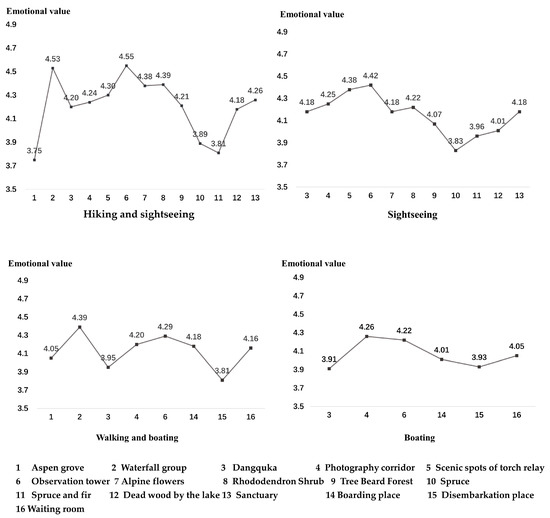 Visitor behavior occurs based on spatial movement and available time, and affective experience is the combined emotional, spiritual, psychological, and learning outcome of the individual’s dynamic process of tourist behavior [28,29] During a visit to Pudacuo National Park, visitors are influenced by specific environmental conditions (provision of resources or constraints) that affect their spatiotemporal behavior and stimulate their emotions and cognition to generate experiences. Environmental interpretation provides destination information and orientation services to national park visitors in various ways, promotes visitors’ awareness of interpretation resources, and enables visitors to have a rich and enjoyable ecological experience [30]. When visitors arrive at different interpretive points, different interpretive resource elements and forms of interpretation have different degrees of impact on visitors’ ecological experiences, resulting in changing intensity of the experience. To measure visitors’ intrinsic emotional experience intensity values, data on emotional experience values were collected using the questionnaire method. According to the cluster analysis results, there are four types of visitor clusters: hiking + sightseeing-type, sightseeing-type, hiking+boating-type, and boating-type visitors. An attempt was made to analyze the emotional experience of the four types of visitor clusters by calculating the results of the mean values of the visitors’ scores at the interpretation locations (Figure 5).