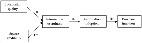 Information usefulness is developed from an individual’s ability to process and filter information about a product or service and whether they consider it is appropriate to make an informed decision [68]. Perceived usefulness is especially applicable within this research, as the volume of content on social media results in individuals processing thousands of messages a day [69] and, therefore, information adoption will be more significant when the individual perceives the information to be useful [17,70]. Hence, this study proposes its third hypothesis: