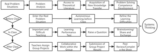 Thirdly, the development of business systems thinking is driven by real problems. The development of business systems thinking skills is centered on real problems, with collaborative group inquiry and problem solving being the main form of interaction and goal, while project output is the main line throughout [38]. Authentic problem situations enable learners to engage in sustained inquiry and enhance learning motivation, and challenging problems develop students’ problem-solving skills. Students engage in cognitive processing and form cognitive conflicts during collaborative group communication, which can promote the development of critical thinking. Critical thinking is self-directed, self-disciplined, self-monitoring and self-reflective thinking, which helps learners improve their metacognitive skills. Through project-based learning, students can become better researchers and problem solvers (see Figure 1).