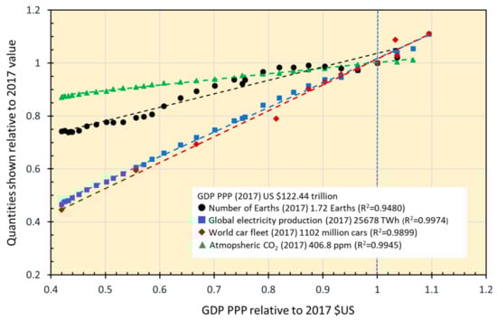 Number of Earths 1990–2018 []; global electricity production, atmospheric 1990–2021 [], atmospheric CO2 levels (ppm) 1990–2021 [], and world car fleet [,,] vs. global GDP (2017 PPP USD) []. All quantities shown relative to 2017 values, see legend. Linear trends shown as dashed lines; R2 see legend.