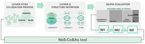 This section introduces (1) the conceptual framework of CLEVER-Cities project; (2) the specific methodology to define CLEVER-Q, where the NbS psychosocial co-benefit assessment tool is integrated and described, including the collaborative process; (3) the proposal for the above-mentioned tool; and (4) the validation process of this tool, along with the Delphi method. Figure 1 summarizes the process under which the NbS psychosocial co-benefit assessment tool was developed.