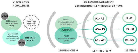 The first dimension is related with NbS’ benefits on general health and wellbeing (Challenge 1 in CLEVER), including attributes, such as perceived general health, subjective wellbeing, restorative capacity, and environmental comfort (acoustic, thermal, lighting, visual, and overall). The second dimension is associated with the NbS’ benefits on psychosocial issues (Challenges 3 and 4 in CLEVER), related to sense of belonging, socio-environmental justice, social cohesion, participation, place satisfaction, and citizen safety.