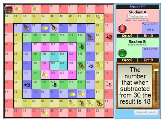 In this tournament, students play a computer-based board game []. Its objective is to improve performance in word problems, which is a great challenge in mathematics education []. Our team designed the game in 2002 and started to use it for online interclass tournaments in 2014. Each player plays against a student from another school in a sequence of alternating rounds. The score of each student adds to the score of her class. The student has three beads to run through a spiral path of cells (Figure 3). The path ends at the center of the board, where the goal is located. On each turn, the student moves a lever that activates a raffle, from which a word problem randomly emerges. The solution to the word problem is the number of positions that the player has to move one of her three beads. The player chooses the most convenient bead. If she moves an incorrect number of positions, she loses points. If, after moving the bead, it ends up in a cell containing coins, then she wins the corresponding amount of points. If her bead arrives at a position with a springboard with a number, then she has to move the bead forwards or backwards the corresponding number of positions. If the bead ends up in a position with a trap then her bead goes to the start cell. If her bead ends up in position containing one of their rival’s beads, then that rival’s bead goes back to the start cell. Therefore, the player has to select which bead to move in order to maximize her gain. The player that reaches the goal cell first obtains extra points and the play is over.