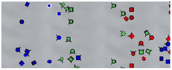 This is a synchronous interclass tournament []. We designed the first version of the game in 2009, and started to use it for online interclass tournaments in 2012. It involves organisms belonging to three species, each of which is a different color. The species of red color feeds on the green species, which in turn feeds on the blue species, and the blue species feeds on the red species (Figure 4). Thus, the three species form a nontransitive cycle. At the beginning of the game, the platform randomly assigns a species to each team. It also assigns to each student of the team a herd of four organisms belonging to the team’s species. Different teams can have organisms of the same species, but the game assigns organisms, so that initially all species have an approximately equal number of organisms. The game has several rounds. Each round corresponds to one generation. During the tournament, students play six rounds, which takes a total time of 60 to 90 min.