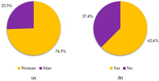 The study involved 235 students—60 men (25.5%) and 175 women (74.5%) (Figure 1a)—studying for a degree in primary education at the University of Huelva, the University of Seville, and the University of Santiago de Compostela, selected as a non-probabilistic convenience sample [54] and chosen on the basis of the participation of these universities in the research project within which this work is framed.