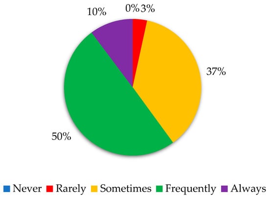 Conversely, in contrast with the results of studies by Estepa et al. [55] and Ferreras et al. [1], who reported that future primary and secondary teachers showed a lack of relevance regarding heritage in their teaching and learning proposals, 50% of the future primary teachers surveyed in this study declared their predisposition to use heritage ‘almost always’ in their classrooms, and 10% declared to do so ‘always’, just as was reported in the study by Sampedro-Martín [56], wherein more than 50% of the primary school teachers claimed to use heritage elements quite frequently.