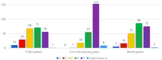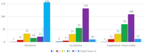 In this study, the majority of pre-service teachers reported a medium-high level of knowledge of gamification—43.4% marked it as 4, and 37.4% responded with a 3. However, we can observe that in 66.4% of cases, they were unaware of one of the most useful gamified activities in the classroom, Breakout, as Moreno-Fuentes [34] states in his study, where he affirms that the acceptance of this tool by future teachers is high—28.2% rated it with a 4 and 53.8% gave it a 3. On the other hand, the same participants who claimed to have a certain degree of knowledge about gamification were those who denied (72.3%) having received any training on the subject or declared that they had not undergone, as students in the different educational stages, experiences in which their teachers used gamified activities in the teaching-learning process.