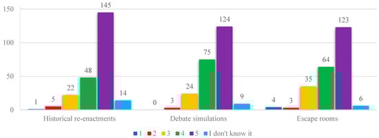 According to Cuenca et al. [27], the use of gamified activities such as video games or augmented reality, less valued in this study but equally taken into consideration—23.8% rated the video game with a 5 and 30.2% with a 4, while 46.4% rated augmented reality with a 5—among other proposals such as role playing or debates, which were more valued than the previous ones (88.5% and 84.7% rated them respectively between 4 and 5), demonstrates the potential of teachers as facilitators of learning and motivators of eco-social educational processes. The documents analyzed by these authors in their research show the importance of the curricular design of innovation proposals through a new selection of contents, such as controversial heritage, and interactive methodological aspects, such as gamified activities, among which the educational use of video games stands out. To this list, this study adds role-playing games, Escape Rooms, Breakouts, and Civil Dialog [48], providing a new way of understanding interaction in the processes of teaching and learning about heritage for citizenship education and approaches to RSPs and sustainability.