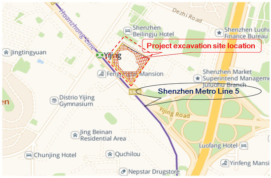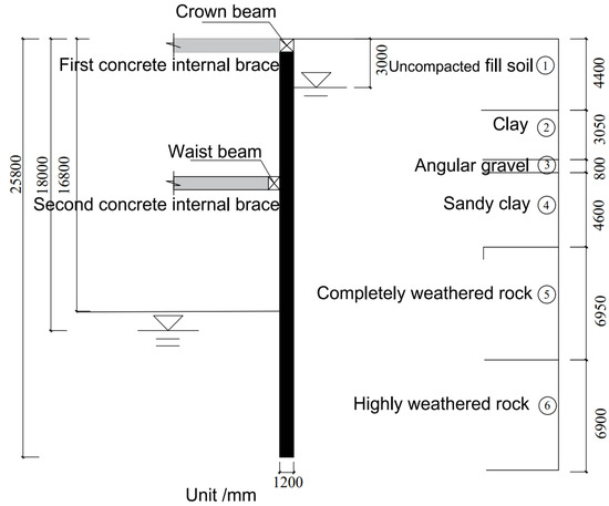 This project is located southeast of the Yijing Station on Line 5 of the Shenzhen Metro in Luohu District, Shenzhen. It is influenced by the F1322 fault zone. The fault zone is the main fault in the fault group, with a length of 38 km and a width of 7–70 m, with a maximum width of approximately 267 m. The soil parameters are selected based on the survey report, as shown in Table 1. The simplified stratigraphic structure and thickness of the site from top to bottom are: uncompacted fill soil, with a thickness of 4.4 m; clay, with a thickness of 3.05 m; angular gravel, with a thickness of 0.8 m; sandy clay, with a thickness of 4.6 m; completely weathered rock, with a thickness of 6.95 m; highly weathered rock, with a thickness of 6.90 m, moderately weathered rock, not penetrated. The excavation support safety level is level one, with a total area of approximately 8900 m2, a circumference of approximately 380 m and a maximum excavation depth of 16.8 m. The support structure is composed of piles and internal supports, with two internal supports set at an interval of 8.5 m. The pile diameter of the retaining piles and the column piles is 1.2 m, the pile length of the retaining piles is 25.8 m and the pile length of the column piles is 20.0 m. The section sizes of the crown beam, waist beam, and support beam are all 1.0 m × 1.2 m. The concrete strength level of the retaining piles, support beams, connecting beams, and column piles is C30. The cross-sectional dimensions and physical-mechanical property indicators of the support structure are shown in Table 2. The plan position of the excavation engineering and the excavation cross-section diagram are shown in Figure 1 and Figure 2.