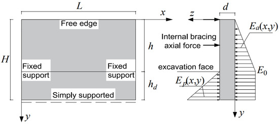 The calculation model of the underground continuous wall is shown in Figure 3. A rectangular coordinate system centered on the continuous wall is established, where the x-axis points to the direction of the wall span, the y-axis points downward to the height of the wall, and the z-axis points to the thickness direction of the excavation wall. The size of the underground continuous wall is L × H, and the wall thickness is d. Ea and Ep are the active and passive soil pressures, respectively, and E0 is the active soil pressure at the bottom of the excavation.