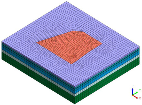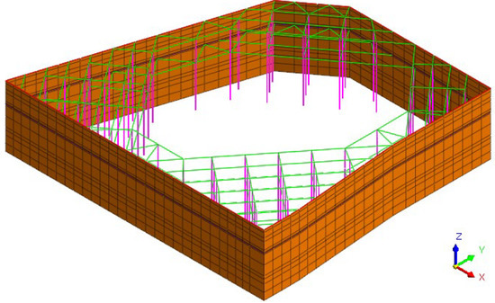 The three-dimensional stress-seepage coupled analysis model was established using MIDAS GTS NX finite element software. Considering that the influence range of the excavation on the surrounding environment is about 3~5 times the excavation depth, [25] the deformation of the soil outside this range is negligible. Therefore, the numerical calculation model size is selected as: length × width × height = 225 m × 200 m × 45 m, as shown in Figure 4. It is assumed that each soil layer adopts an ideal elastoplastic model, which conforms to the modified Mohr–Coulomb strength criterion. The support structures of the foundation pit are all modeled using a linear elastic model. The foundation pit retaining piles are simulated using an equivalent earth wall model, with an equivalent thickness of 0.88 m. To better reflect the effect of the interlocking piles on seepage control, interface contact elements are used to simulate the cutoff walls in MIDAS GTS NX finite element analysis software, with the permeability coefficient set to 0, and the interface parameters generated automatically by the finite element software interface assistant. The foundation pit support system and cutoff wall arrangement are shown in Figure 5 and Figure 6.