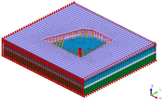 To accurately simulate the lateral deformation characteristics of the retaining piles under the coupled effect of excavation and dewatering of the foundation pit, horizontal constraints were applied around the model, and vertical constraints were applied at the bottom to limit horizontal and vertical displacements. The top was set as a free boundary, as shown in Figure 7. Based on the geological exploration data and specific engineering design, the actual construction conditions of the Luohu Center deep foundation pit support project were moderately simplified using MIDAS GTS NX finite element analysis software, and the analysis process of each construction stage in this simulation is shown in Table 3.