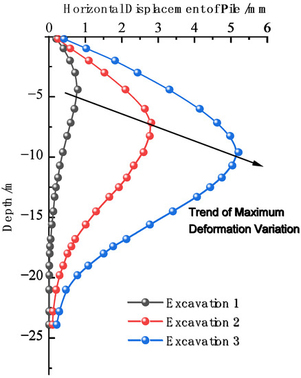 The soil pressure difference generated by the excavation and unloading of the foundation pit causes lateral displacement of the retaining piles towards the direction of the foundation pit. The curve showing the change in horizontal displacement of the retaining pile caused by excavation of the foundation pit under finite element numerical calculation is shown in Figure 8. The lateral displacement of the retaining piles has obvious regional characteristics. The lateral displacement from the top of the pile to the bottom shows a “swollen belly” curve distribution, with small lateral displacement under the constraint of internal support at the top of the pile and embedding at the bottom. The maximum deformation position is close to the excavation face. With the progress of excavation, the maximum deformation position of the pile body continuously moves downward. When the excavation is completed, the maximum deformation position of the pile body is near the lower part of the foundation pit and the maximum deformation value is 5.21 mm.