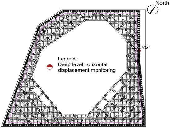 The layout of the measured points in the plane of this article is shown in Figure 9. The field measurement content is the horizontal displacement of the deep retaining pile. One monitoring point is arranged for all the interlocking piles, and the results of a certain measured point on the northeast side of the excavation are selected for comparative analysis in this paper.