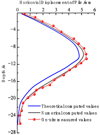 The comparison and analysis of theoretical, numerical and field measurement results of the deformation of the foundation pit retaining pile are shown in Figure 10. The numerical results of the three are basically consistent, indicating that the theoretical calculation value and finite element calculation value can reflect the actual situation to a certain extent. When the excavation of the foundation pit is completed, due to the neglect of the translational deformation of the wall, and only considering the rotational deformation, the theoretical calculation result of the deformation near the bottom of the wall is significantly deviated. In fact, the elastic thin plate theory [26,27,28] based on small deformation theory is greatly affected by time effect [14], and when the deformation is large, the soil has undergone plastic deformation, so the theoretical calculation value is smaller than the measured value. The finite element calculation result is smaller than the measured result, which may be due to the rapid expansion of the deformation of the retaining pile caused by the excavation of the foundation pit without considering the stratification and zoning of the foundation pit, peripheral loading, and timely support reinforcement. Therefore, measures such as strict “segmentation and stratification” excavation, avoidance of peripheral loading, and optimization of construction organization should be taken to reduce the impact of foundation pit excavation on the deformation of the retaining pile.