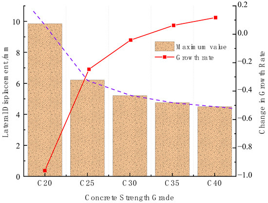 The stiffness of the retaining piles in the foundation pit is mainly influenced by the structural elastic modulus and the sectional moment of inertia [29]. By adjusting the stiffness of the retaining piles, the influence of the stiffness variation on the deformation of the retaining piles can be analyzed. The structural elastic modulus is reflected by the structural material, namely the concrete strength of the retaining piles. While keeping the other engineering design parameters constant, the concrete strength grades are sequentially adjusted to C20, C25, C30, C35 and C40, and the influence of different elastic moduli on the deformation of the retaining piles is studied. As shown in Figure 11, the lateral displacement curve of the retaining piles under different concrete strengths is obtained. With the increase of concrete strength, the elastic modulus of the retaining piles also increases, and the deformation of the retaining piles contracts. The maximum deformation position remains basically unchanged.