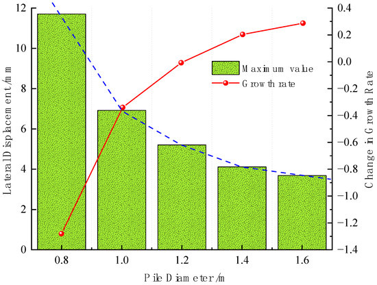 To further quantify, extract the maximum lateral displacement value of the retaining piles under different diameters, and obtain the influence curve of different diameters on the maximum deformation of the retaining piles as shown in Figure 14. As the diameter increases, the maximum deformation of the retaining piles decreases approximately in a nonlinear function, and within a certain range of diameters, the curve is approximately an exponential function. Taking the section inertia distance I under a pile diameter of 1.0 m as the baseline, the growth rate k (ΔSmax/Δ) of the maximum lateral displacement of the retaining piles is introduced. The growth rate decreases approximately in a logarithmic function with the increase of the diameter. When the diameter is 0.8 m, the maximum lateral displacement of the retaining piles is 7.62 mm. When the diameter is further reduced, the increasing trend of the maximum lateral displacement approximately follows a logarithmic function, and the deformation of the retaining piles increases sharply, exceeding the deformation control range, and resulting in engineering quality and safety problems caused by the too-small stiffness of the retaining piles. From this point of view, it is considered that the diameter of the retaining pile affects its stiffness, and the diameter should not be less than the limit of 0.8 m to ensure the safety stiffness reserve of the retaining pile.