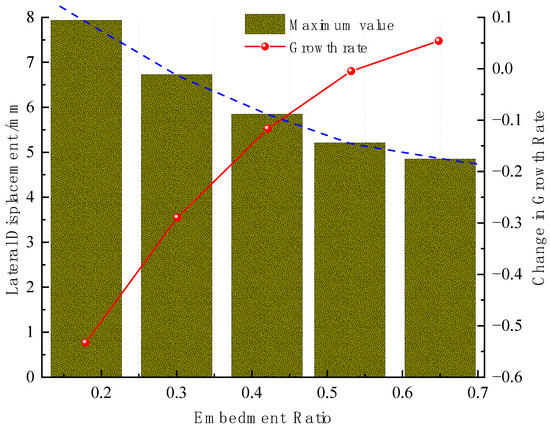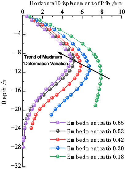 Horizontal displacement of retaining pile with different embeddedness ratio.
