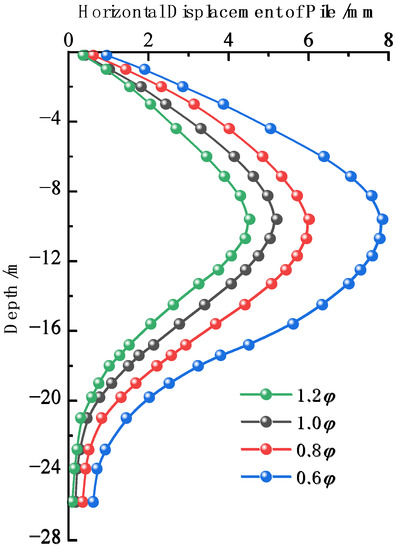 Horizontal displacement of retaining pile with different frictional angle.