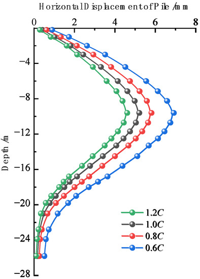 While keeping the other geological parameters constant, the cohesion was adjusted to 0.6 C, 0.8 C, C and 1.2 C in turn, and the influence of the change in cohesion on the deformation of the retaining pile was studied. As shown in Figure 18, the deformation law curve of the retaining pile with the change of cohesion was obtained. Under different cohesion, the deformation of the retaining pile excavated by the foundation pit dewatering showed a “bulging” curve law. With the increase of cohesion, the physical and chemical interactions between soil particles increased, the displacement of the soil in the active zone on the pile side decreased, resulting in the contraction of the retaining pile deformation, and within a certain range, the rate of deformation reduction decreased, and the deformation amount was negatively correlated with the increase of the cohesion increment.