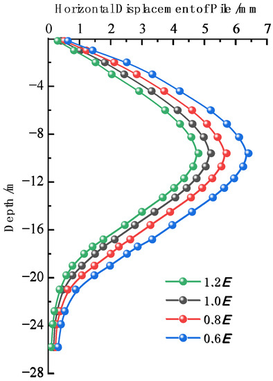 Horizontal displacement of retaining pile with different elasticity modulus.