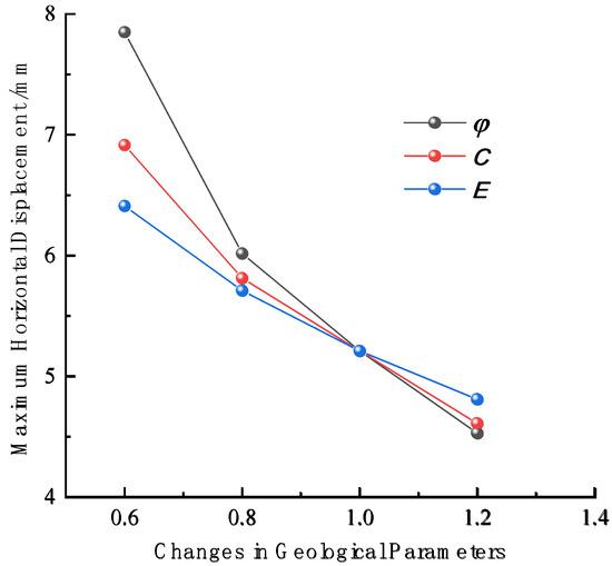 To determine the strength of the influence of geological parameters, including internal friction angle φ, cohesion C and elastic modulus E, on the maximum deformation of retaining piles under the coupling effect of excavation and dewatering in the influence area of the fault zone, sensitivity analysis of the maximum displacement of retaining piles under different geological parameters is performed.