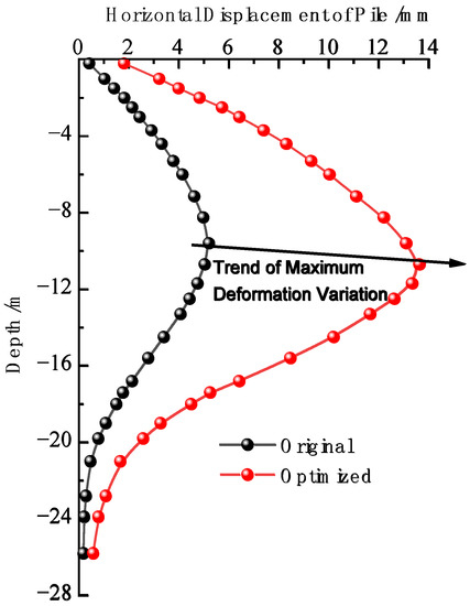 Comparison of horizontal displacement of retaining pile before and after optimization.