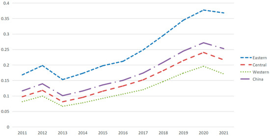 As can be seen from Figure 4 and Table 12, due to distinct regional development statuses and advantages, the degree of coupling and coordination between the digital economy and green technology innovation varies greatly among Chinese areas. Specifically, the eastern region has the highest average coupling coordination degree between the digital economy and green technology innovation, and its average coupling coordination degree is the sole region among the three regions that exceed 0.44; the central region’s coupling coordination degree between the digital economy and green technology innovation has increased from 0.2809 in 2011 to 0.4056 in 2021, second only to the eastern region; the lowest coupling coordination degree between the digital economy and green technology innovation is the western region, with an average value of 0.256.