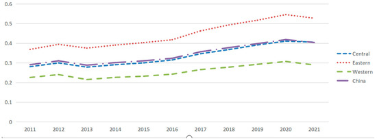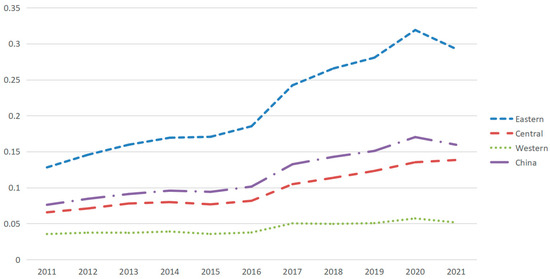 The trends in the overall digital economy system scores by region across the country from 2011–2021 are shown in Figure 2.