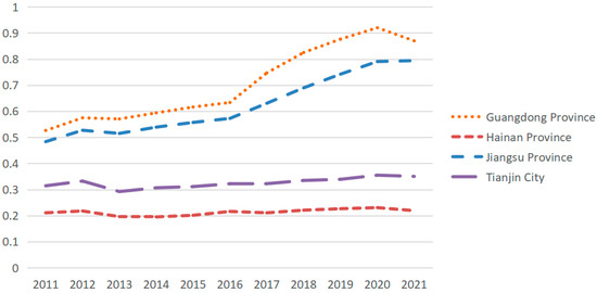 The three areas’ digital economies and green technological innovation all display varied degrees of growth from the trend of the coupling and coordination degree, showing that the synergy between the two is constantly expanding; from the absolute value, the regional coupling and coordination degree is less than 0.6, indicating that the coupling and coordination of the digital economy and green technology innovation in China is generally at a low level. According to the particular data, the “digital gap” brought on by uneven regional growth is what accounts for China’s overall low level of coupling and coordination between the digital economy and green technology innovation. Taking the eastern region as an example, the degree of coupling and coordination between Guangdong Province, Hainan Province, Jiangsu Province, and Tianjin City exhibits a “Matthew effect”, as shown in Figure 5. The reason for this is that Hainan Province is unable to enjoy the dividends of digital economy development due to its relatively backward infrastructure, further widening the “digital divide” between provinces, while the regional disparity in digital economy development tends to exacerbate the imbalance and imbalance of green technology innovation between regions, ultimately forming a resistance to innovation in green technology development, resulting in certain regions being in a “low-end equilibrium” state in terms of the digital economy and the development of green technology innovation. At the same time, Guangdong Province and Jiangsu Province, with their rich resource advantages, are well supplied with factors for the expansion of the banking and technological sectors. As a result of these provinces’ early and rapid economic development, environmental pollution and damage brought on by economic growth have been identified earlier than in other provinces, and environmental regulations have been implemented to a higher degree than in other provinces and cities. This has led to a highly balanced degree of development for both green technology innovation and the digital economy.
