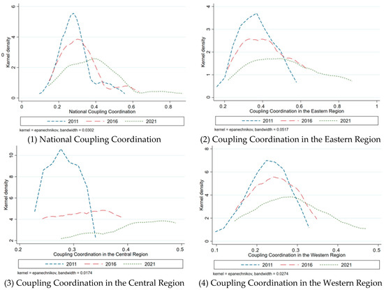 Kernel density curves for coupling coordination nationally and by region.