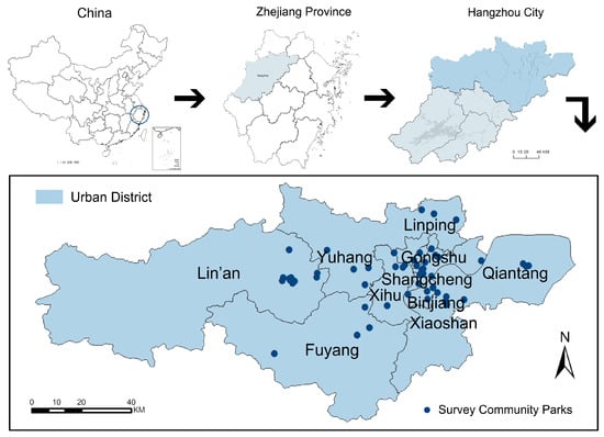 The study utilized a multi-stage stratified sampling process to recruit survey respondents. Initially, community parks with various physical characteristics were screened based on different community types [51] in Hangzhou (see Figure 2). Then, community parks with complex community members and high migrant populations were prioritized, based on information provided by local government agencies. Finally, a total of 50 community parks were selected for the study (Figure 3).
