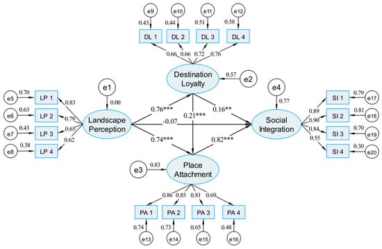 The results show that landscape perception lacks a direct impact on social integration; however, both place attachment and destination loyalty exhibit direct influence on social integration. Furthermore, landscape perception can significantly enhance social integration through the mediation of both place attachment and destination loyalty. Place attachment demonstrates a strong direct and positive relationship with social integration, while destination loyalty exhibits a weaker yet significant direct effect on social integration. Despite lacking a direct positive effect on social integration, landscape perception positively influences place attachment and destination loyalty, thereby mediating an effect on social integration through both constructs. Consequently, all eight hypotheses in this study are valid, except for hypothesis H3, which posits that landscape perception has a direct positive effect on social integration, as demonstrated in Table 5.