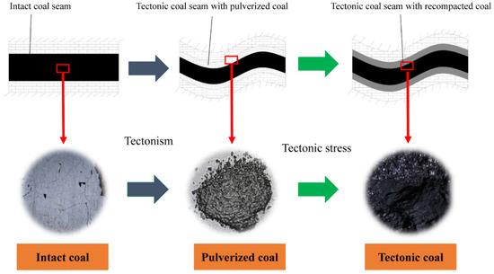 Coal is the main source of energy in China, which plays an important role in ensuring energy security and rapid economic development. However, the coal–bearing strata in China experienced multiple tectonic actions and stress fields, such as Indosinian, Yanshanian, and Himalayan periods, after their formation. During these tectonic movements, the coal underwent various degrees of brittle fracture, broken or ductile deformation, or superimposed destruction under the effect of tectonic stress fields, leading to severe crushing and even pulverization of the coal [1], as shown in Figure 1. The severely crushed or pulverized coal is usually called tectonic coal in China, i.e., tectonic coal is an aggregate of pulverized coal particles. After the formation of pulverized tectonic coal, it can be recompacted under tectonic stress. However, recompaction of the tectonic coal lowers its permeability and makes its gas extraction becomes rather more difficult. Therefore, a large amount of coalbed gas is expected to be released during the recovery of the tectonic coal reservoir. It is well known that coalbed gas is a major greenhouse gas. Thus, the gas emission in the tectonic coal reservoir can induce a serious greenhouse effect.