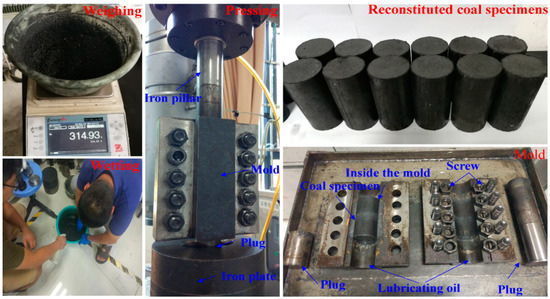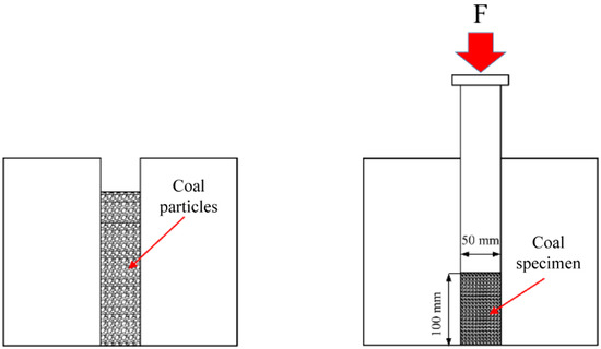 In order to measure the mechanical properties of tectonic coal, the first task is to prepare the standard tectonic coal specimen (Φ50 × 100 mm). Owing to the complete structure and high strength of intact coal, coring and cutting can be achieved [19,20,21]. However, tectonic coal is formed by the compaction of pulverized coal, so it is easily broken and impossible to obtain a core specimen. Therefore, reconstituted coal specimens have been widely adopted to measure the mechanical properties of tectonic coal. The reconstruction principle is shown in Figure 2.