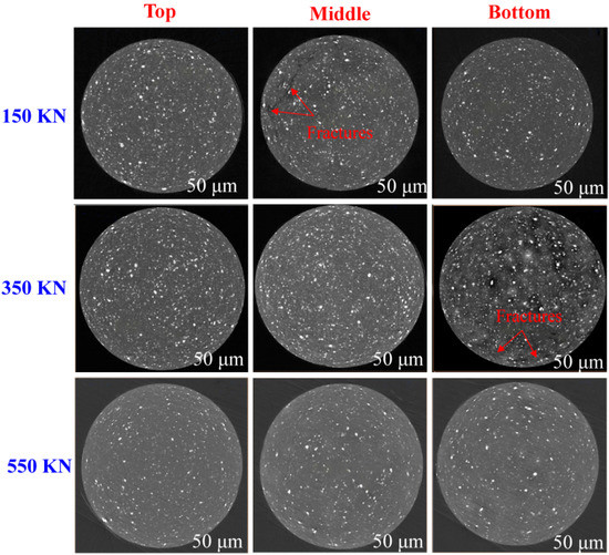 To obtain the internal structural characteristics of the reconstituted coal specimens, computed tomography (CT) scanning experiments with low resolution (50 μm) were conducted in the Taiyuan University of Technology. For brevity, only the CT scan images of three coal samples (i.e., corresponding external force is 150, 350, and 550 KN, respectively) are provided in Figure 4. It is seen from Figure 4 that some clear large–scale fractures exist in the middle or at the bottom of the coal specimens under an external force of 150 and 350 KN, indicating that these specimens have a relatively low compaction degree. Moreover, the large–scale fractures almost vanish in the coal specimen reconstituted at an external force of 550 KN. Therefore, it can be inferred that the compaction degree of the reconstituted coal specimen improves with the increase in the applied external force.